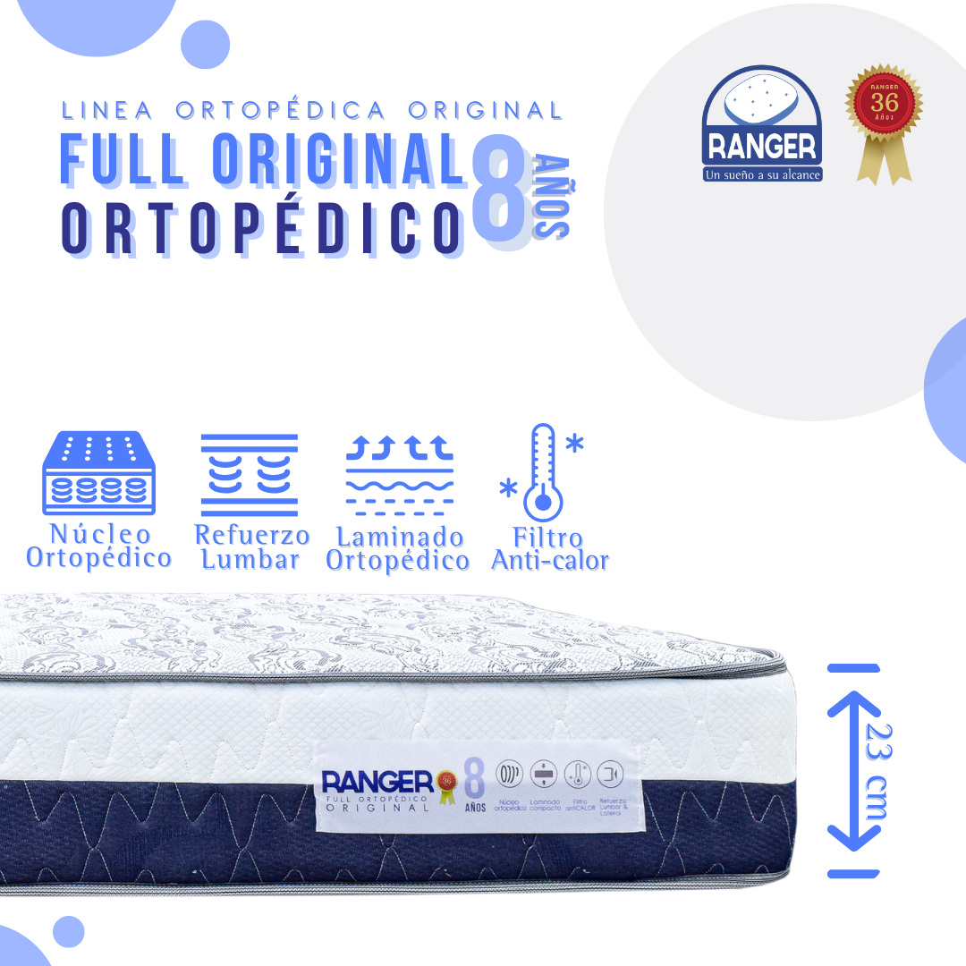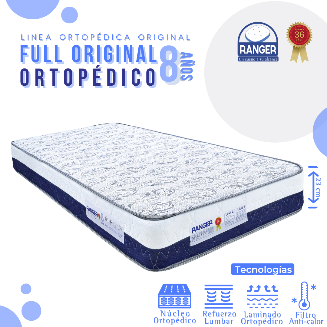 Colchón Full Ortopédico Original. Núcleo ortopédico sellado. Laminado firme alta densidad. Laminado anticalor. Duración alta.
